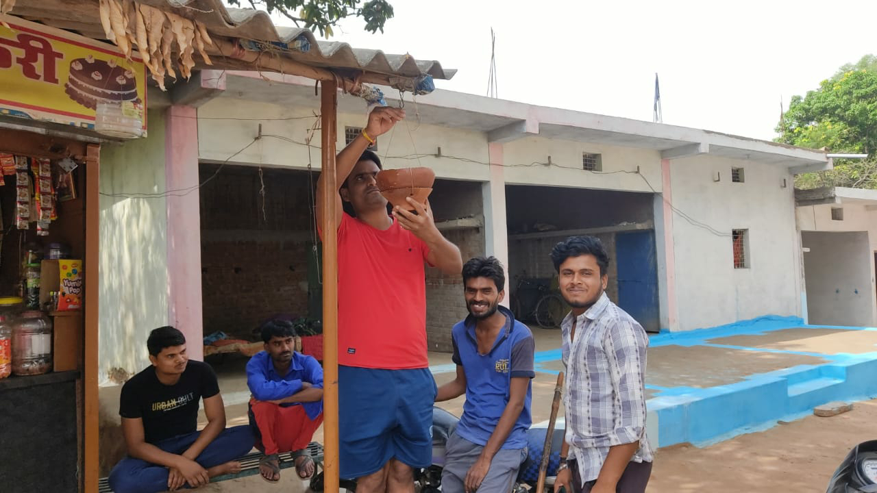 गर्मी में परिंदो की प्यास बुझाने युवाओं ने दुकान और पेड़ पर लटकाए सकोरे।